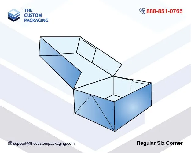 The regular six corner boxes are specially made to cater to the needs of a big number of retailers making them convenient for various products. The assembling of these boxes does not require any technical procedure or professional assistance since they are already glued from the required sides and areas. Furthermore, wholesale Regular Six Corner boxes are shipped flat to the clients but being easy to assemble no special skills are needed to assemble them.